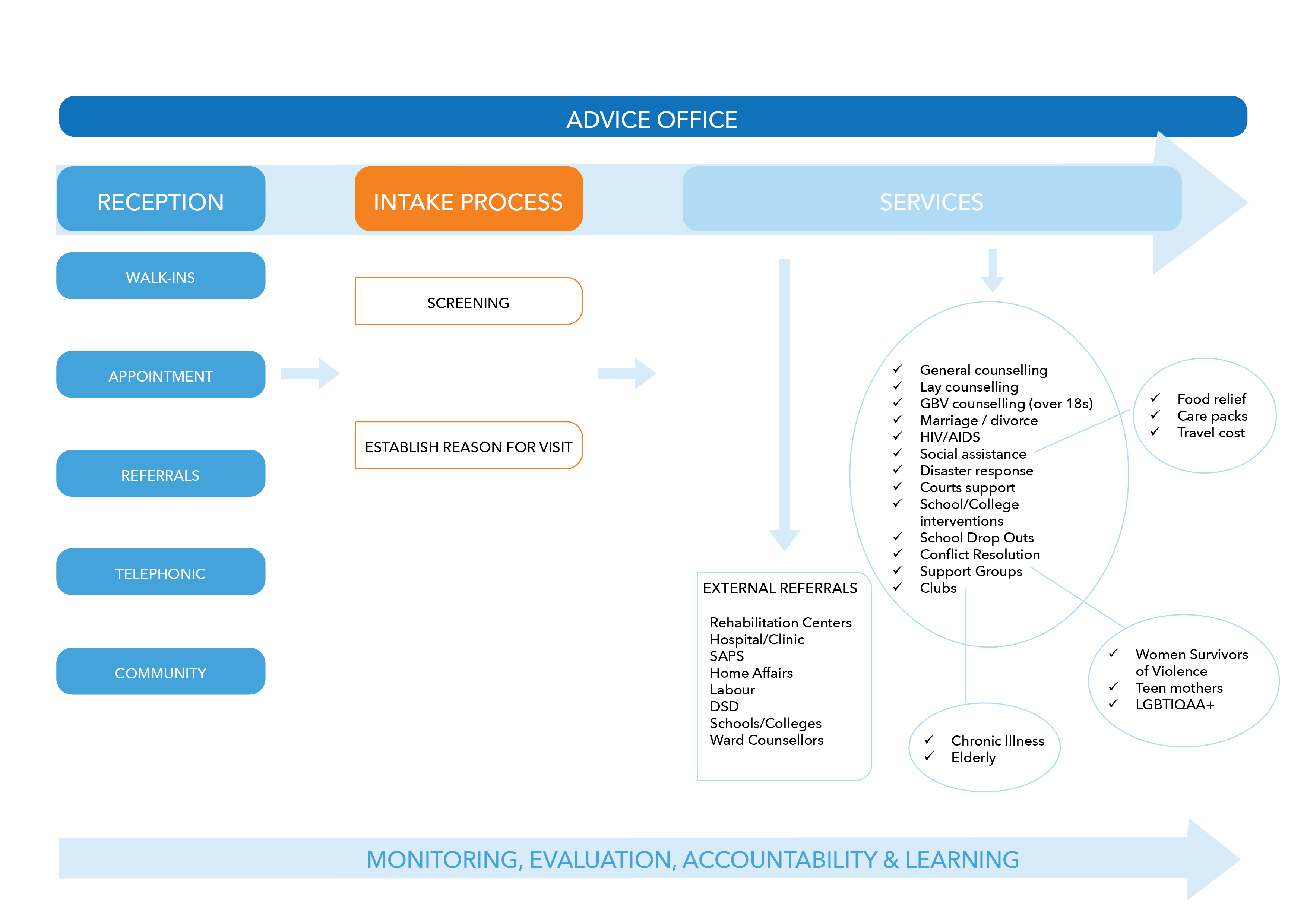 The Advice office is open to anyone from Lavender Hill, Vrygrond/Capricorn and the surrounding communities in need of legal advice on maintenance claims, civil matters, labour law, social grants queries and all other family matters. Guidance, advice, mediation and counselling for various matters are offered. After an intake session, clients are referred to the relevant internal services like the support groups or specialised interventions like NWF GBV social worker and to further external institutions. A typical case would have multiple layers of trauma and incidents that lead the client to seek assistance. The main problems are drawn out to be addressed in counselling and with the new skills obtained by the clients, they then can apply this approach to other problems clients are faced with in their lives. The Advice Office is open during: Monday to Thursday, 09h00-16h00 and Fridays from 09h00-14h30 by appointments.